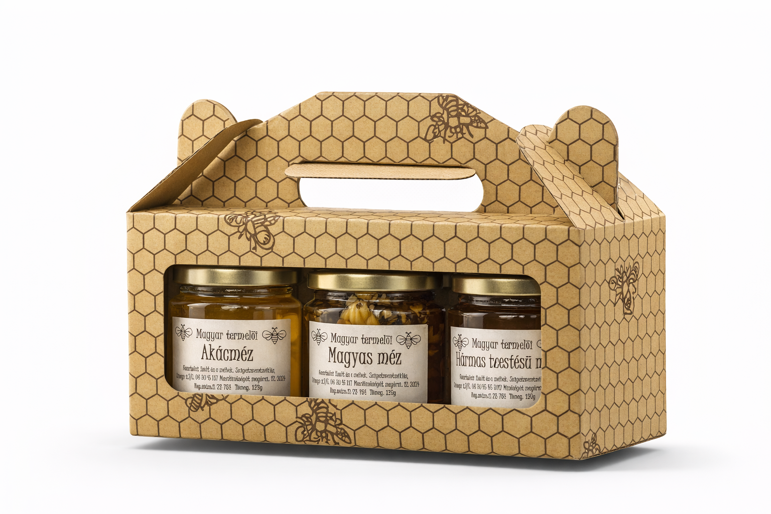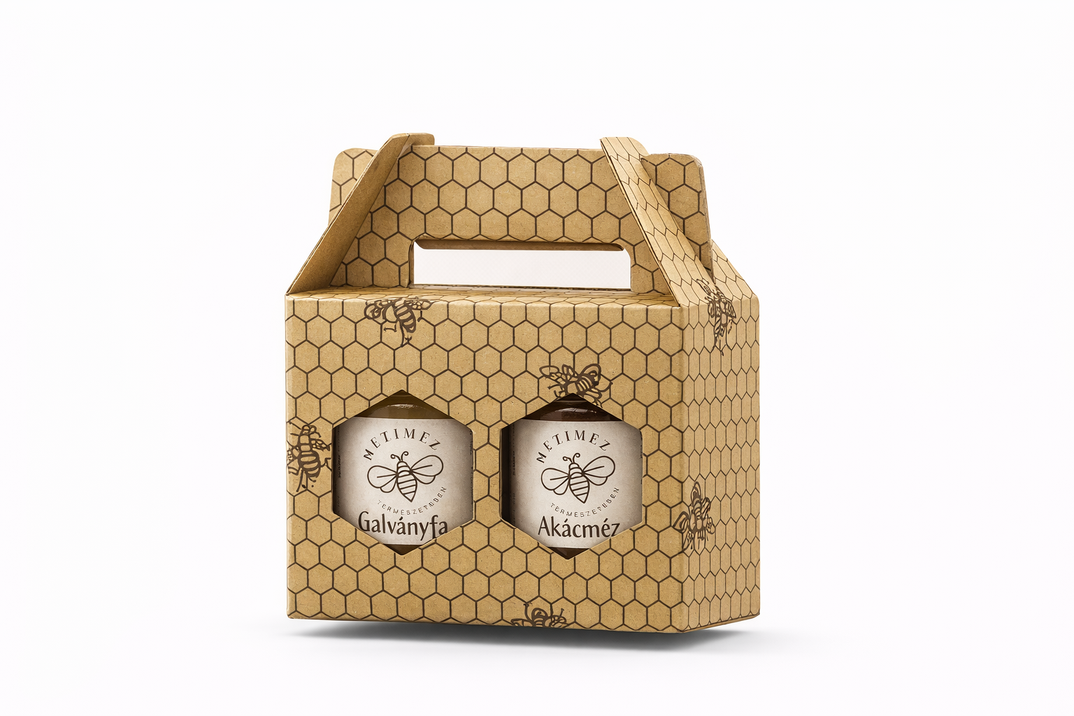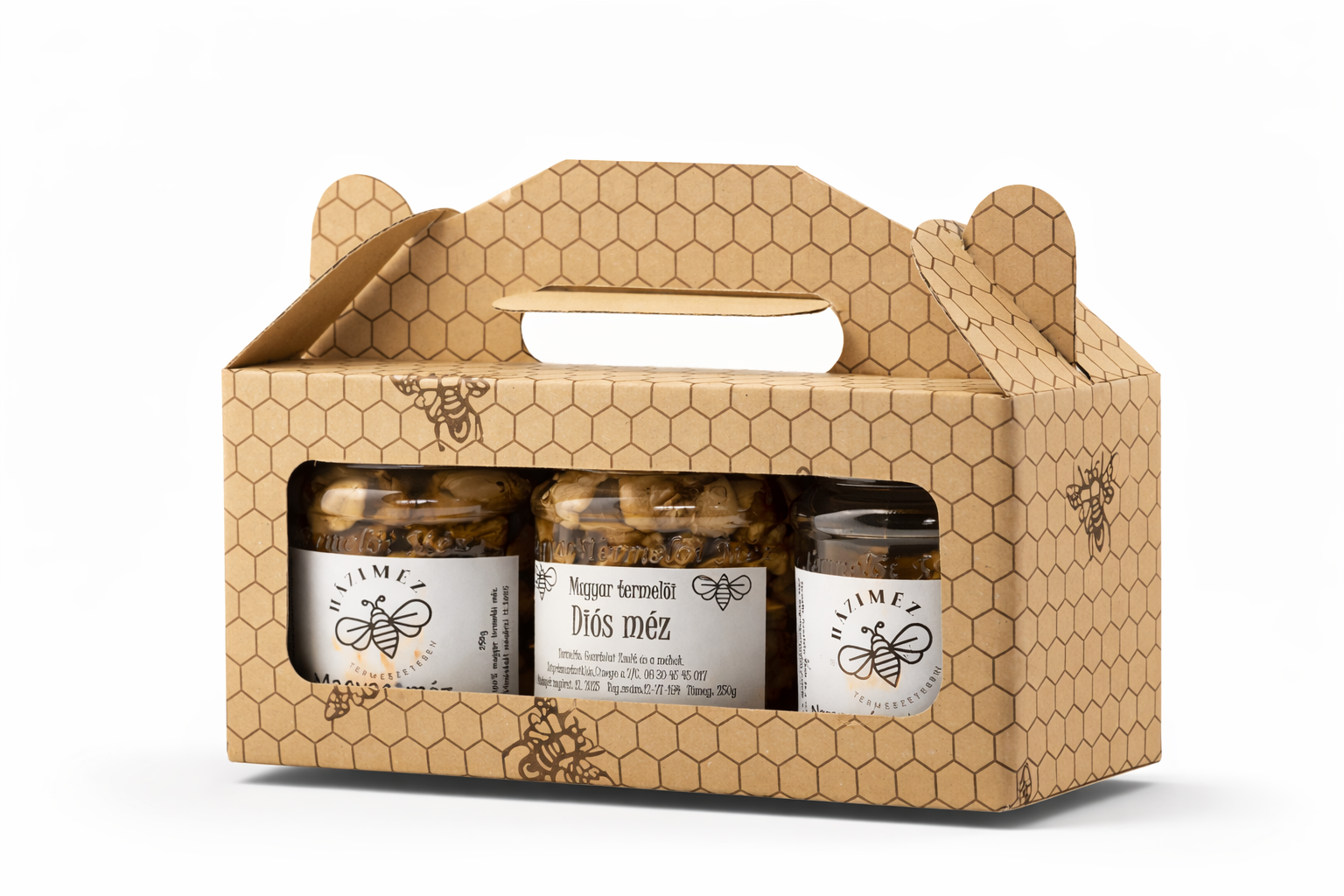 - Kétféle Háziméz (2 × 250 g) – Különböző ízvilágú, természetes eredetű, prémium mézek, amelyek kiválóak teához, süteményekhez, reggelihez vagy mindennapi fogyasztásra.